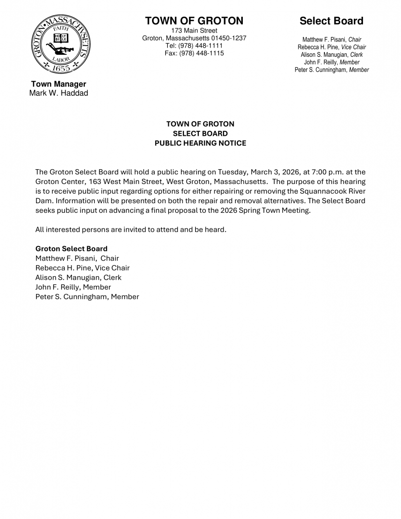 The Groton Select Board will hold a public hearing on Tuesday, March 3, 2026, at 7:00 p.m. at the Groton Center, 163 West Main Street, West Groton, Massachusetts. The purpose of this hearing is to receive public input regarding options for either repairing or removing the Squannacook River Dam. Information will be presented on both the repair and removal alternatives. The Select Board seeks public input on advancing a final proposal to the 2026 Spring Town Meeting.