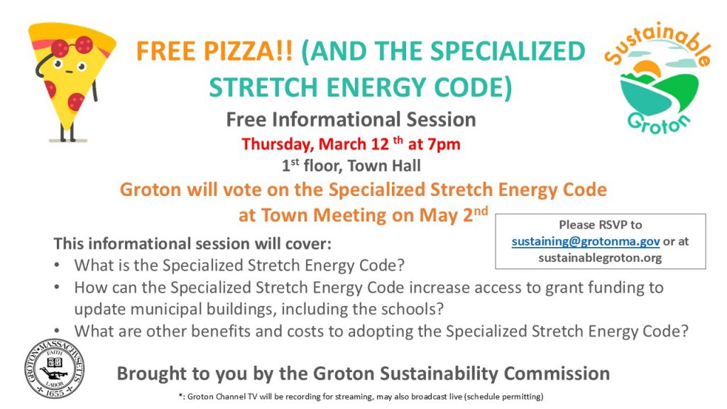 The Sustainability Commission will host an informational forum on Thursday, March 5th at 7pm in the first floor meeting room at Town Hall on the Specialized Energy Stretch Code that the town is voting on at Spring Town Meeting. FREE Pizza will be served. RSVP at sustaining@grotonma.gov.